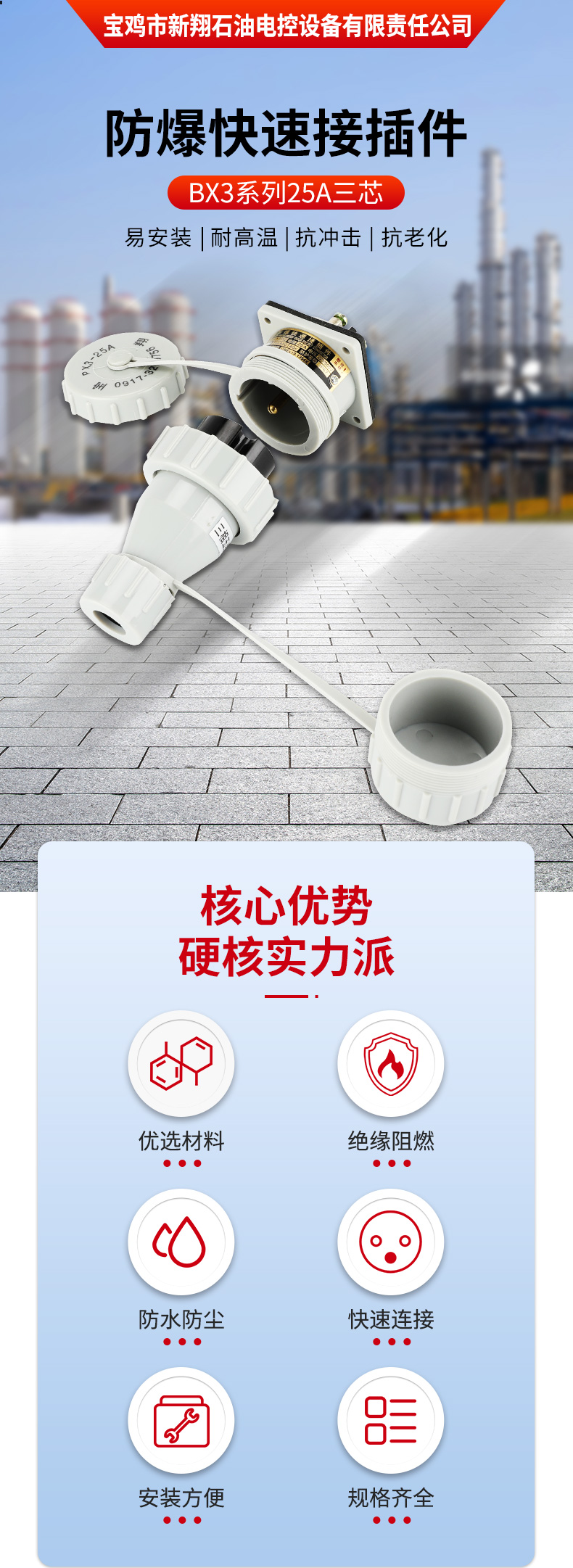 宝鸡市新翔石油电控设备有限责任公司主要从事防爆产品的研发和制造,适用于石油、矿井、国防、电力等领域。公司设备先进、技术力量雄厚,集科研、生产于一体,有相当规模和水平的制造体系,并且严把质量关,己通过ISO9001质量体系认证。